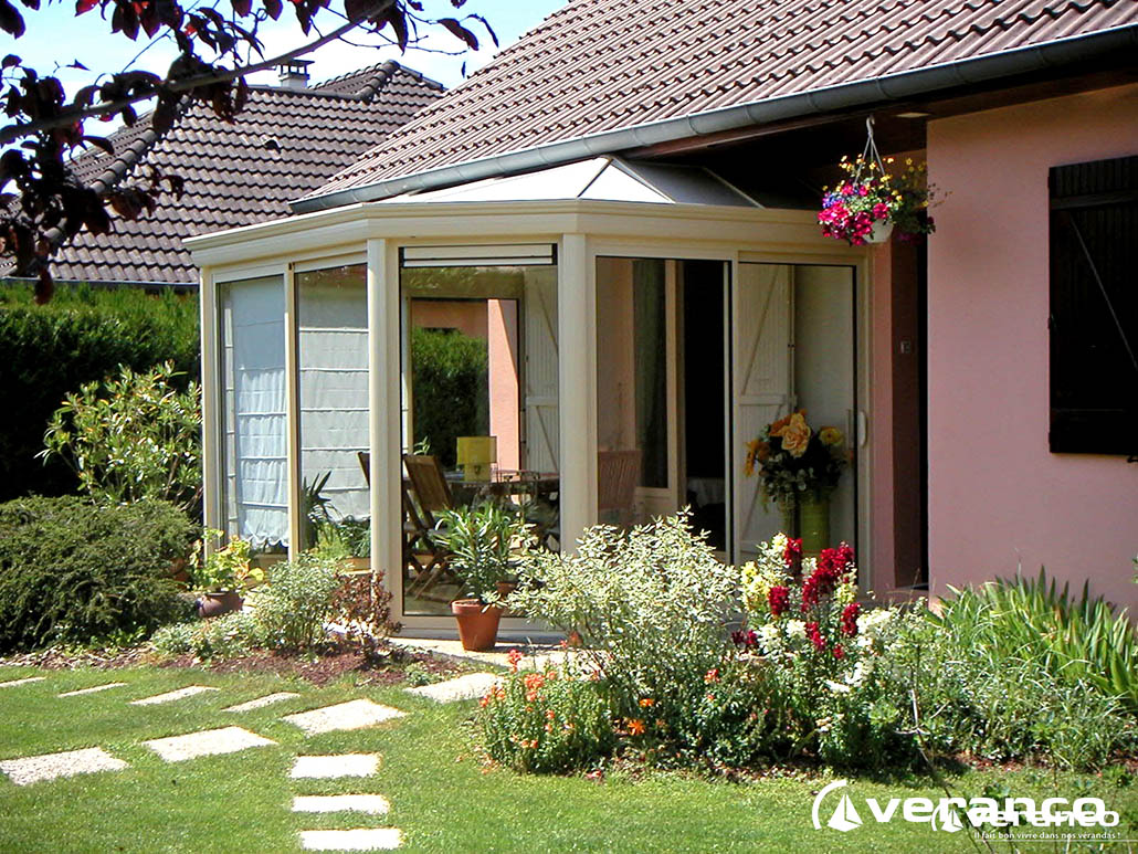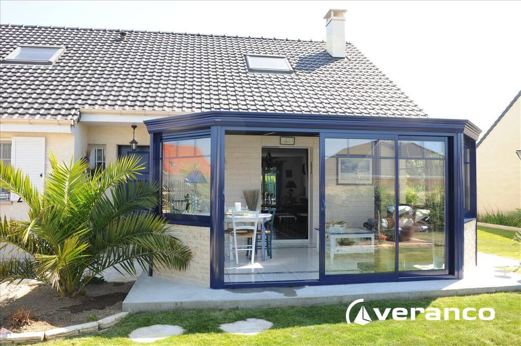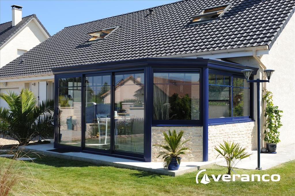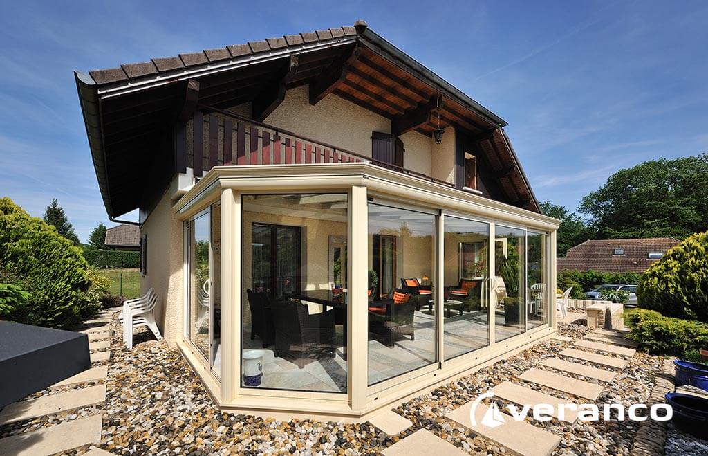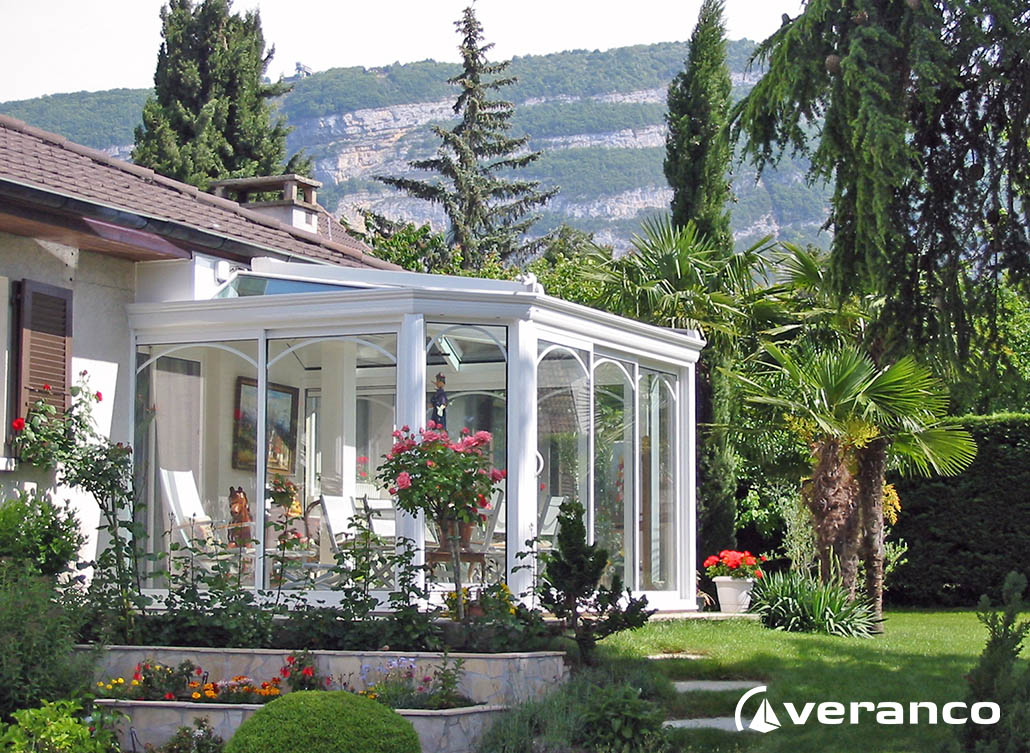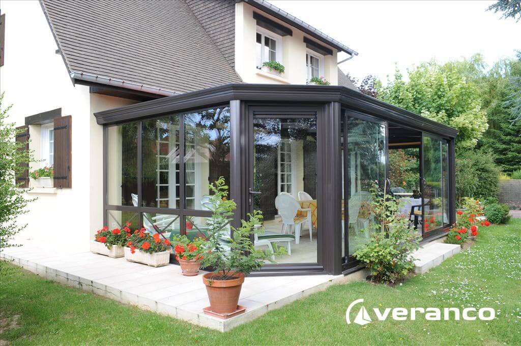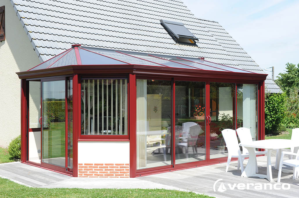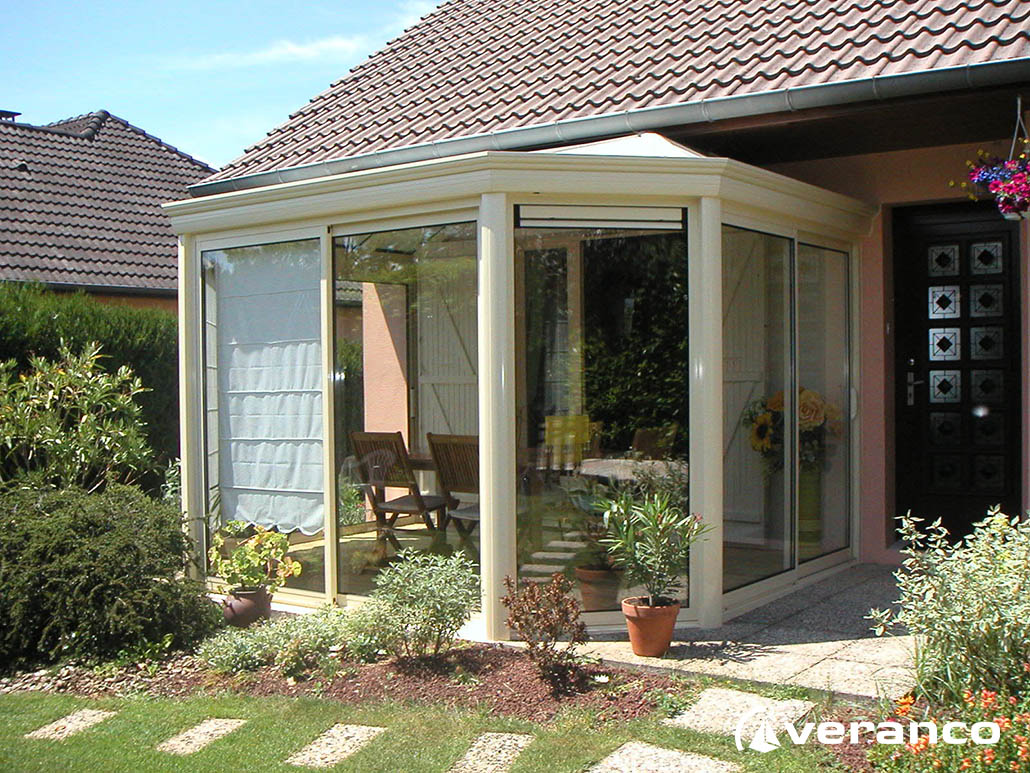 La véranda Emeraude est composée d'une toiture rectangulaire et d'une toiture à facettes dans les 2 angles coupés. . La véranda Emeraude offre une variante esthétique agréable. Sa toiture ‘à facettes’ contribue à l’originalité de son design.  Cette forme adoucie s'intègre harmonieusement à de nombreuses façades. Son architecture et sa construction permettent de réaliser de grandes dimensions de véranda.