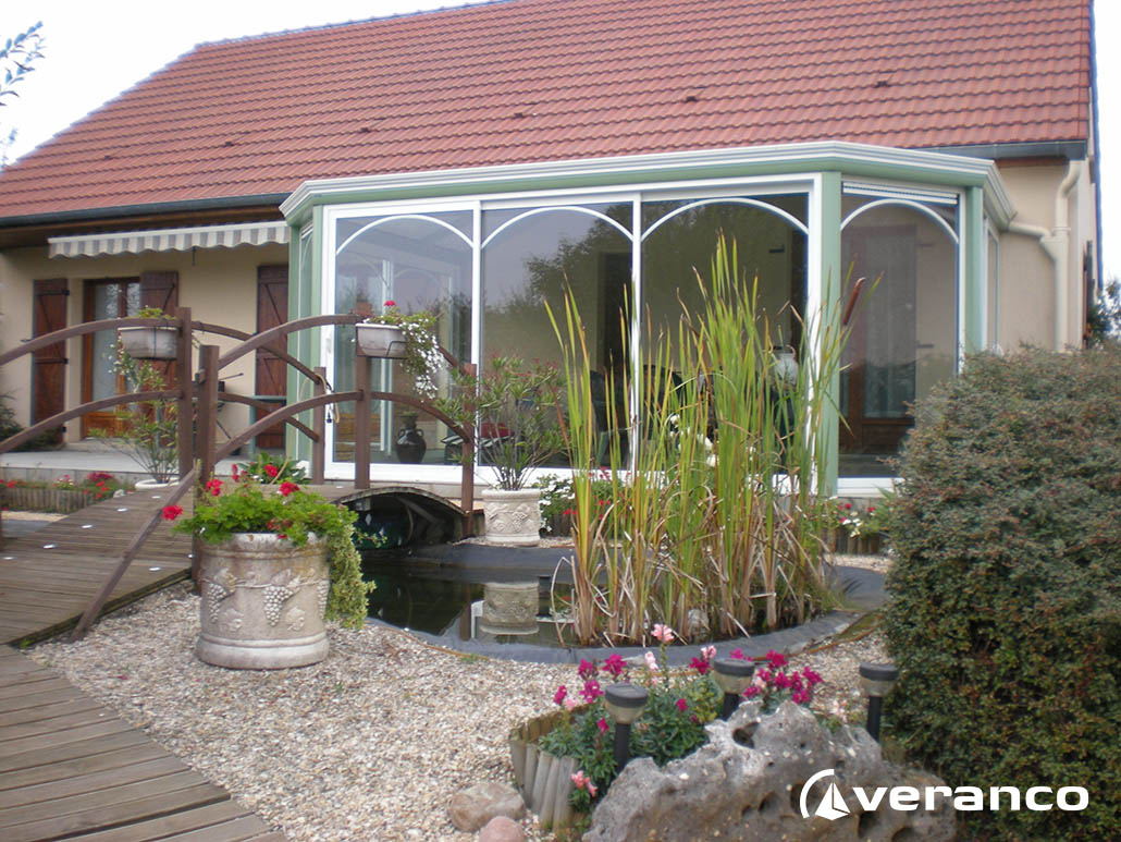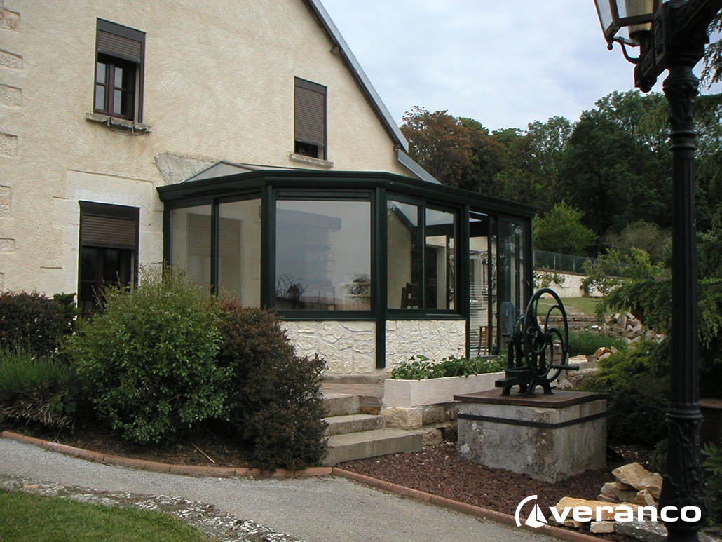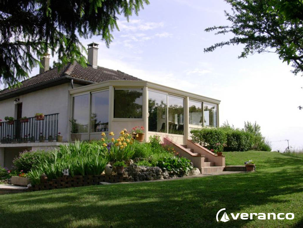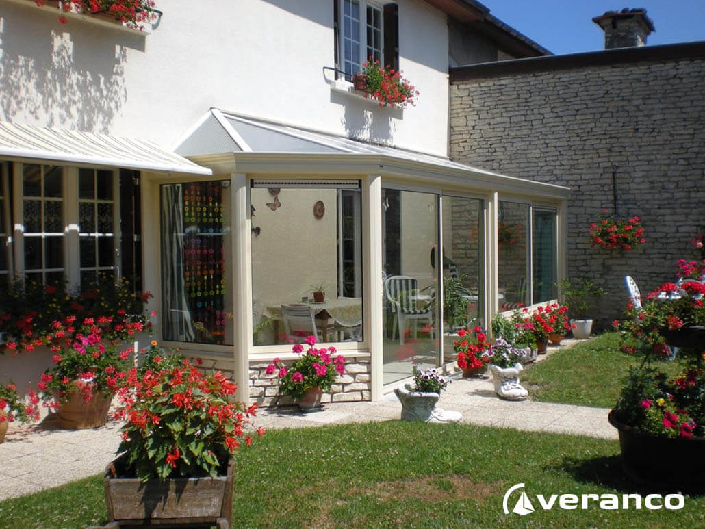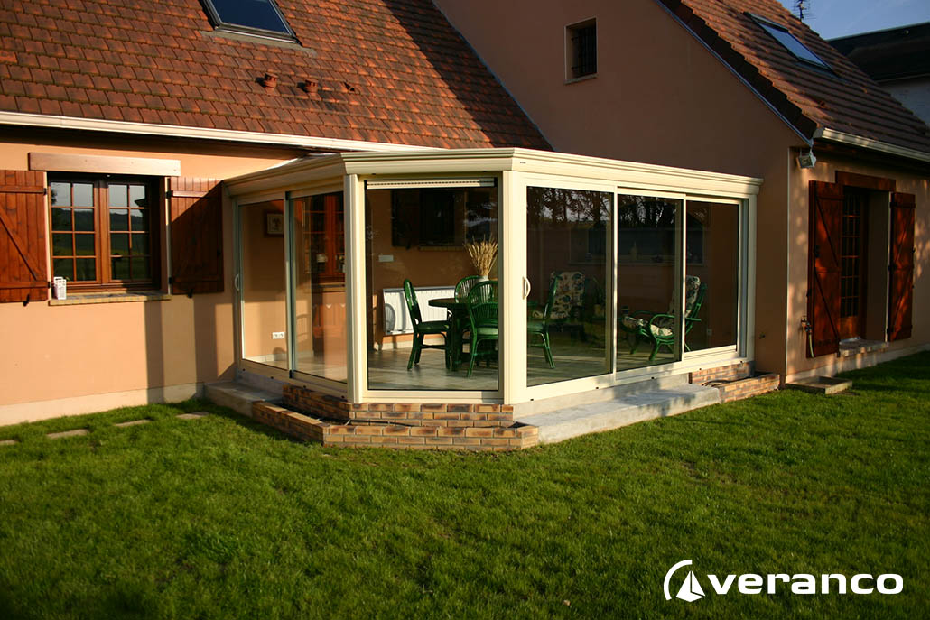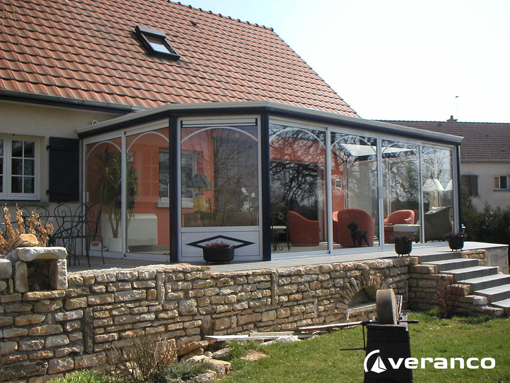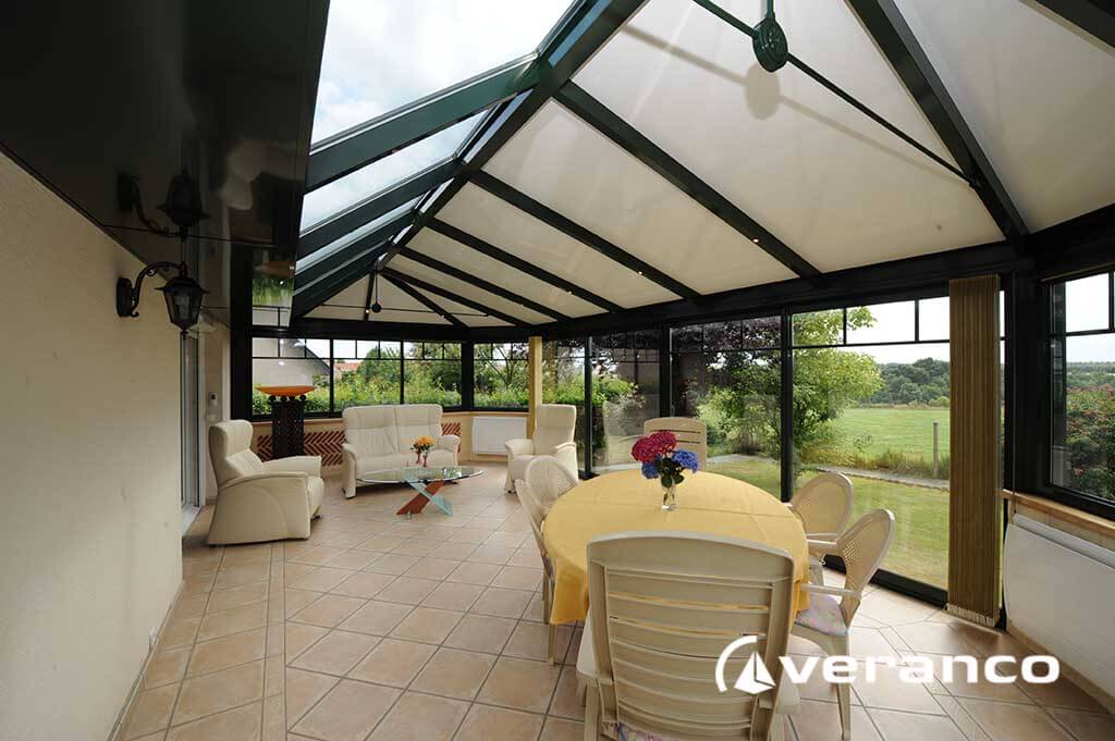 La véranda Emeraude est composée d'une toiture rectangulaire et d'une toiture à facettes dans les 2 angles coupés. . La véranda Emeraude offre une variante esthétique agréable. Sa toiture ‘à facettes’ contribue à l’originalité de son design.  Cette forme adoucie s'intègre harmonieusement à de nombreuses façades. Son architecture et sa construction permettent de réaliser de grandes dimensions de véranda.