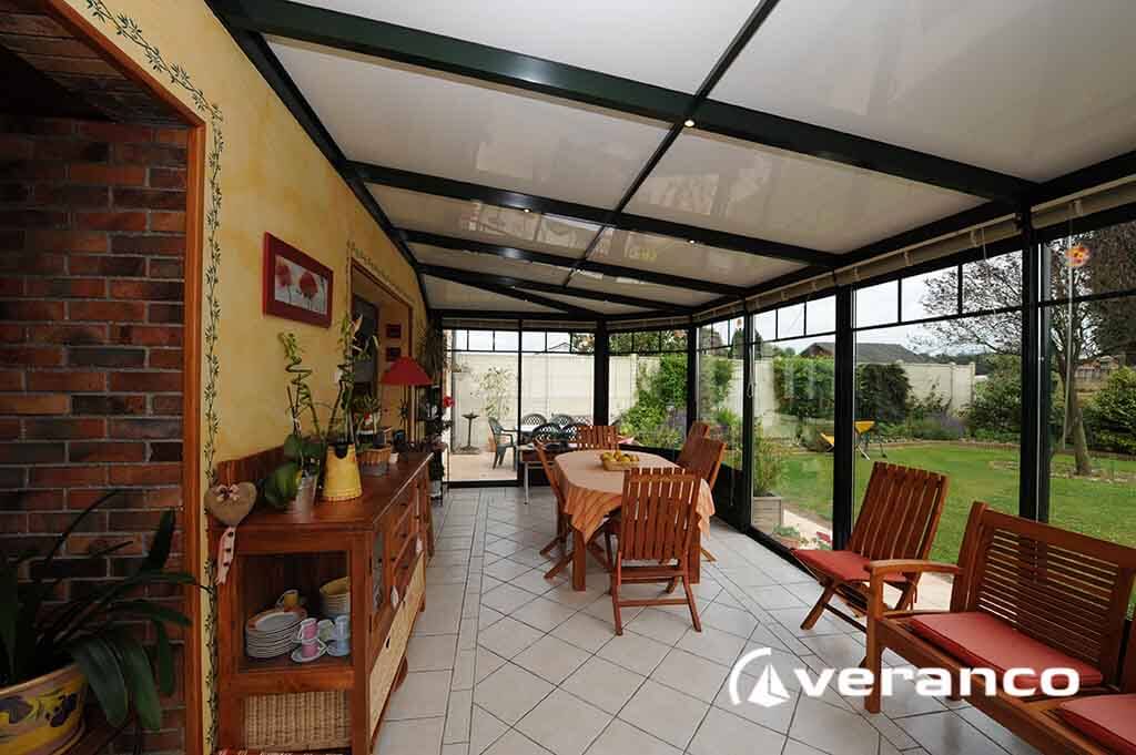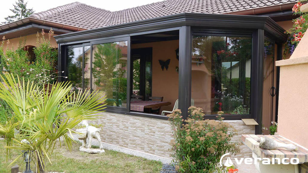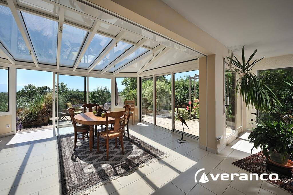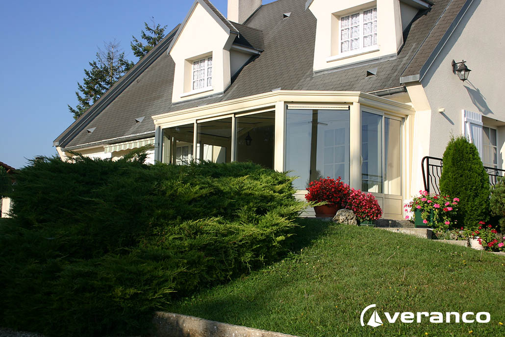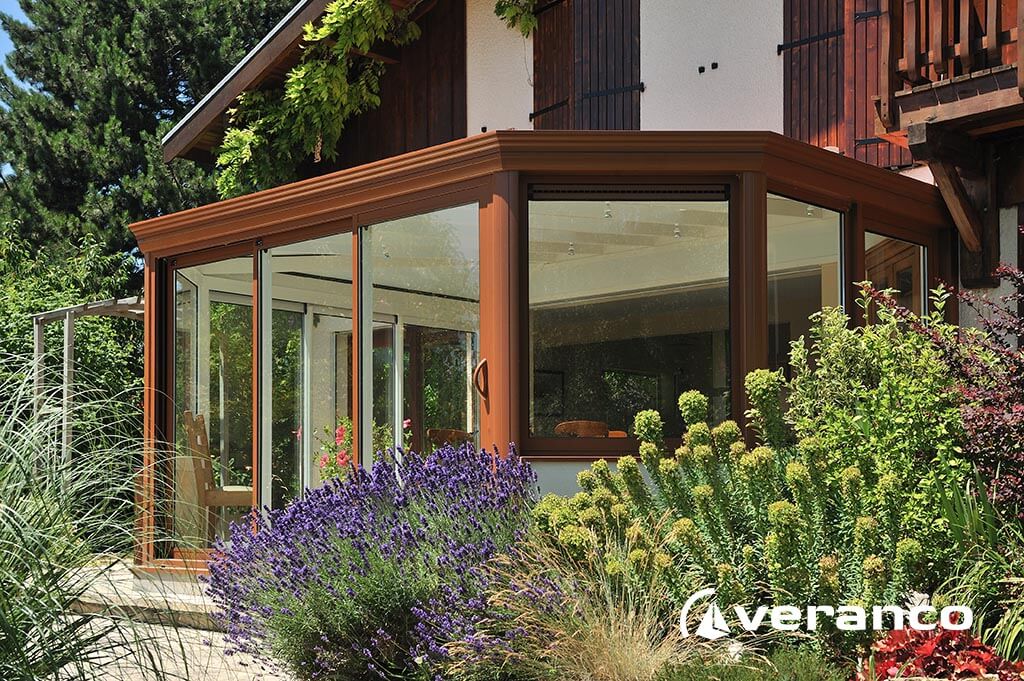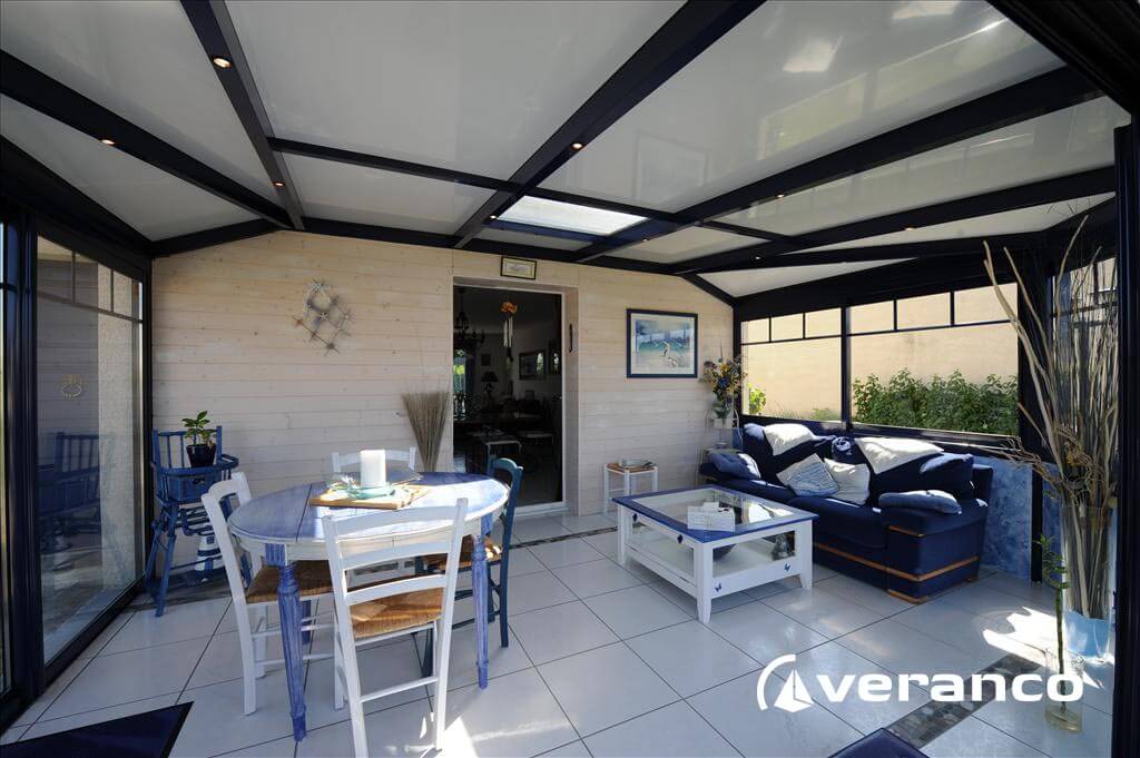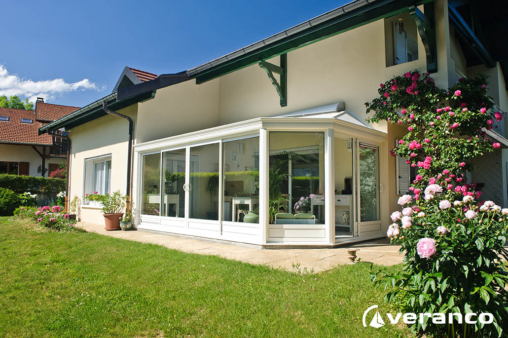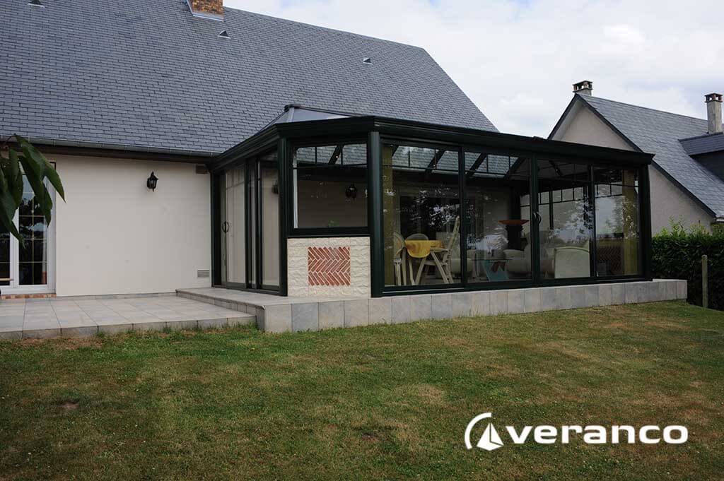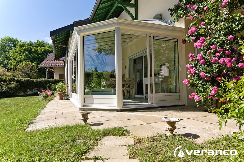 La véranda Emeraude est composée d'une toiture rectangulaire et d'une toiture à facettes dans les 2 angles coupés. . La véranda Emeraude offre une variante esthétique agréable. Sa toiture ‘à facettes’ contribue à l’originalité de son design.  Cette forme adoucie s'intègre harmonieusement à de nombreuses façades. Son architecture et sa construction permettent de réaliser de grandes dimensions de véranda.