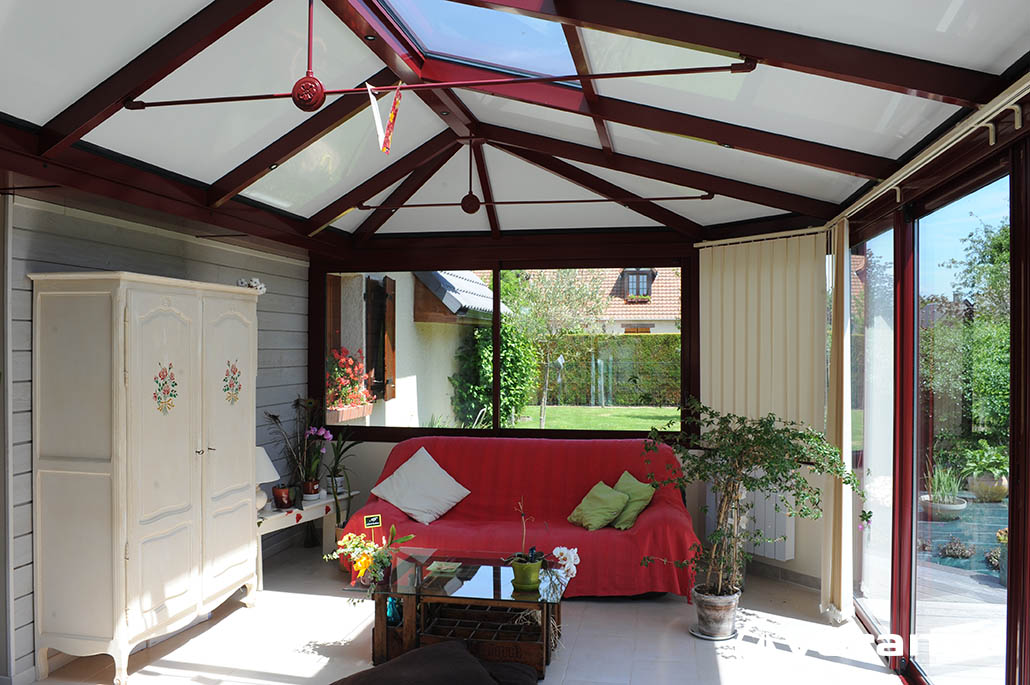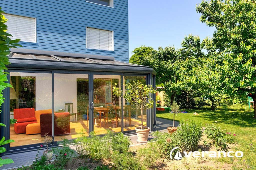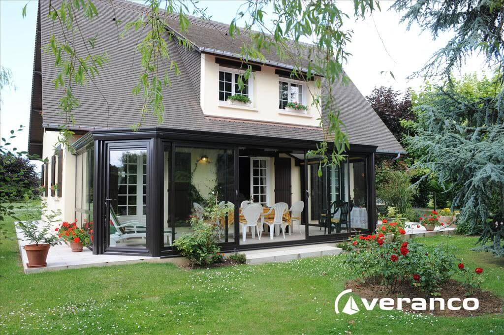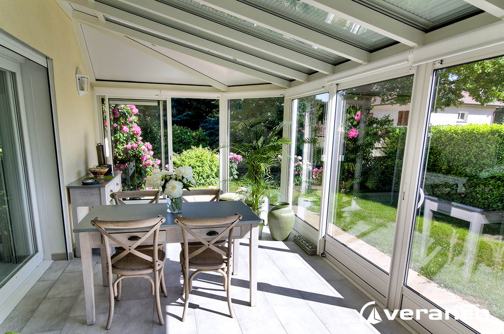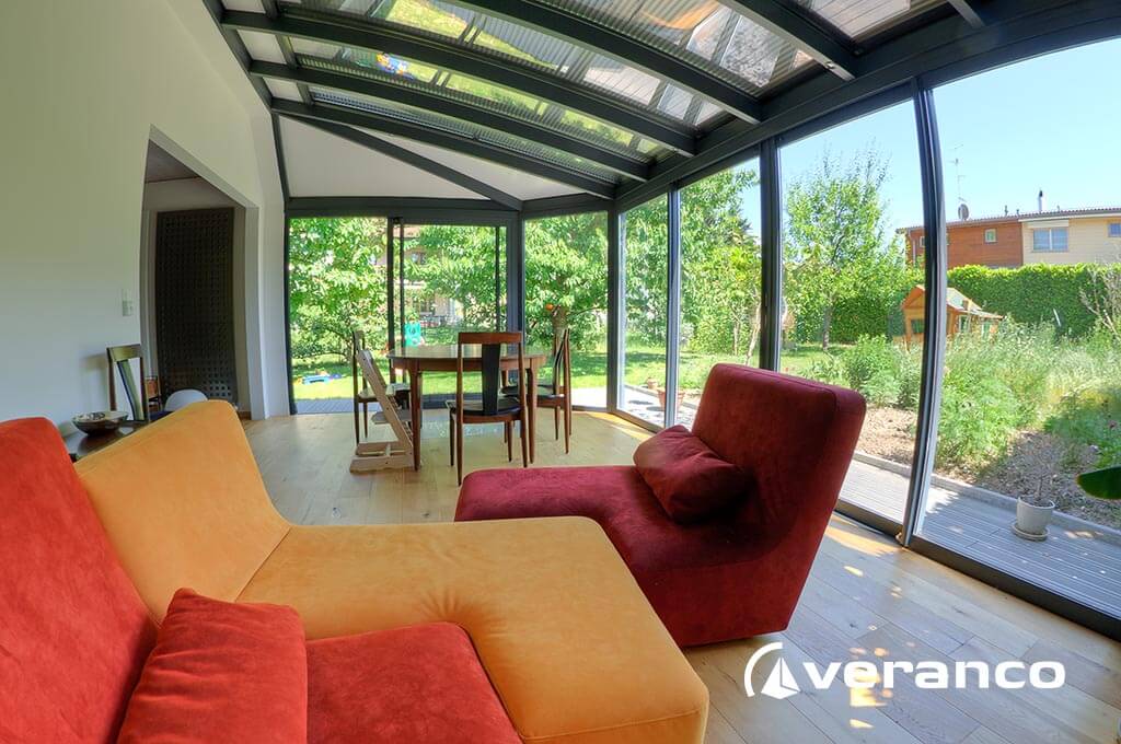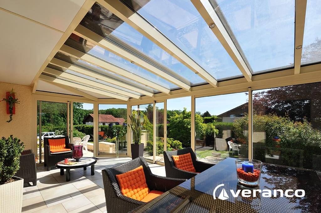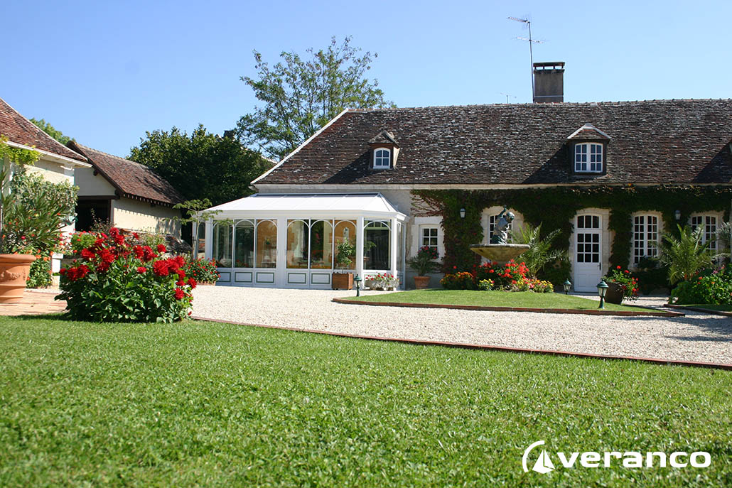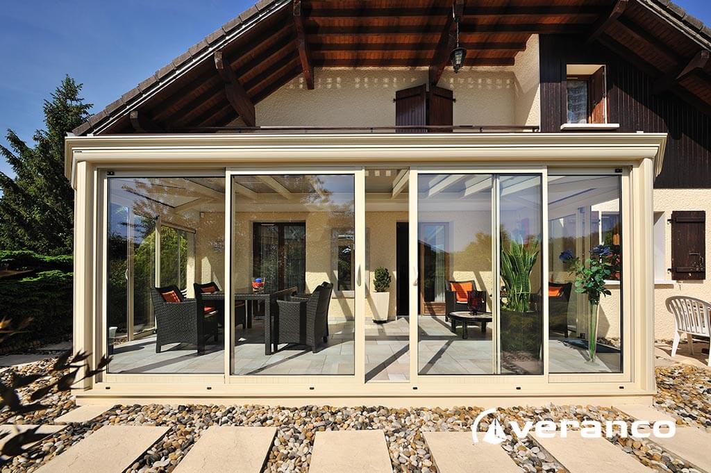 La véranda Emeraude est composée d'une toiture rectangulaire et d'une toiture à facettes dans les 2 angles coupés. . La véranda Emeraude offre une variante esthétique agréable. Sa toiture ‘à facettes’ contribue à l’originalité de son design.  Cette forme adoucie s'intègre harmonieusement à de nombreuses façades. Son architecture et sa construction permettent de réaliser de grandes dimensions de véranda.