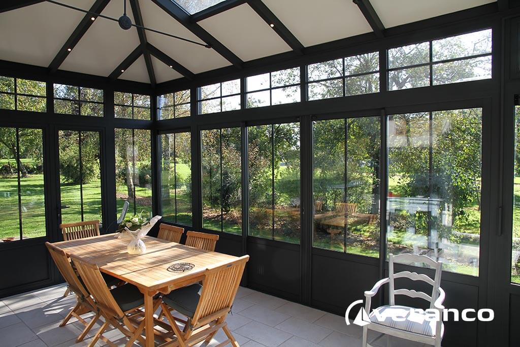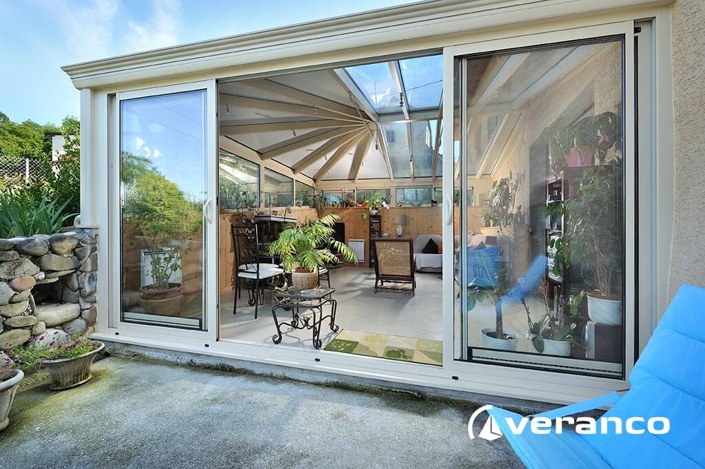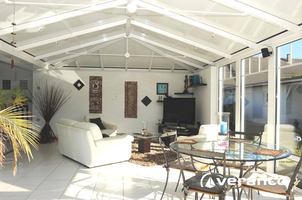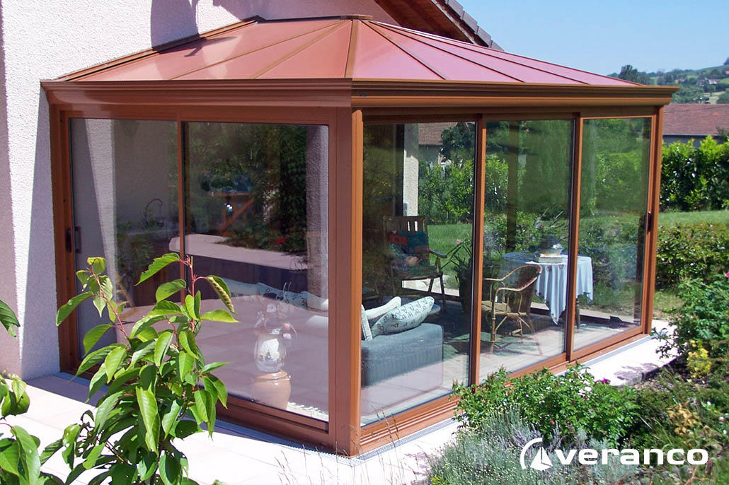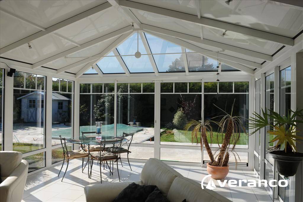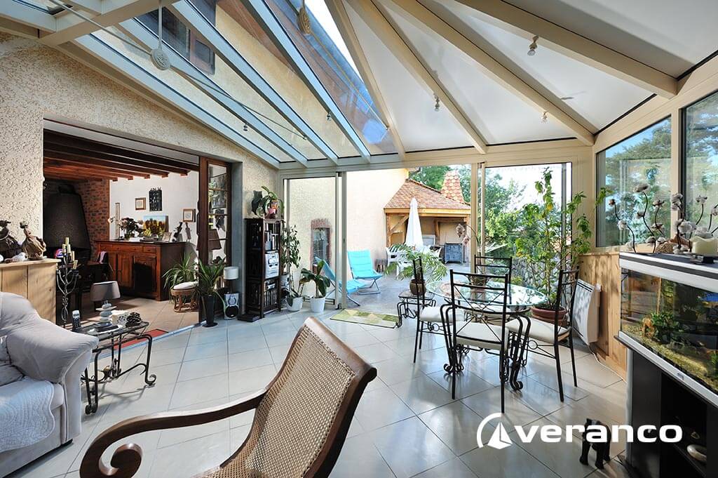 La Véranda Grenat est composée d'une toiture rectangulaire à facettes rayonnantes avec une double pente. Sa toiture offre une grande hauteur sous plafond pour une réelle impression de volume et d'espace. Cette conception permet de jouer astucieusement avec le verre et les panneaux isolant afin de gagner en originalité et en design. La hauteur de sa toiture favorise l’encadrement d’ouvertures hautes.