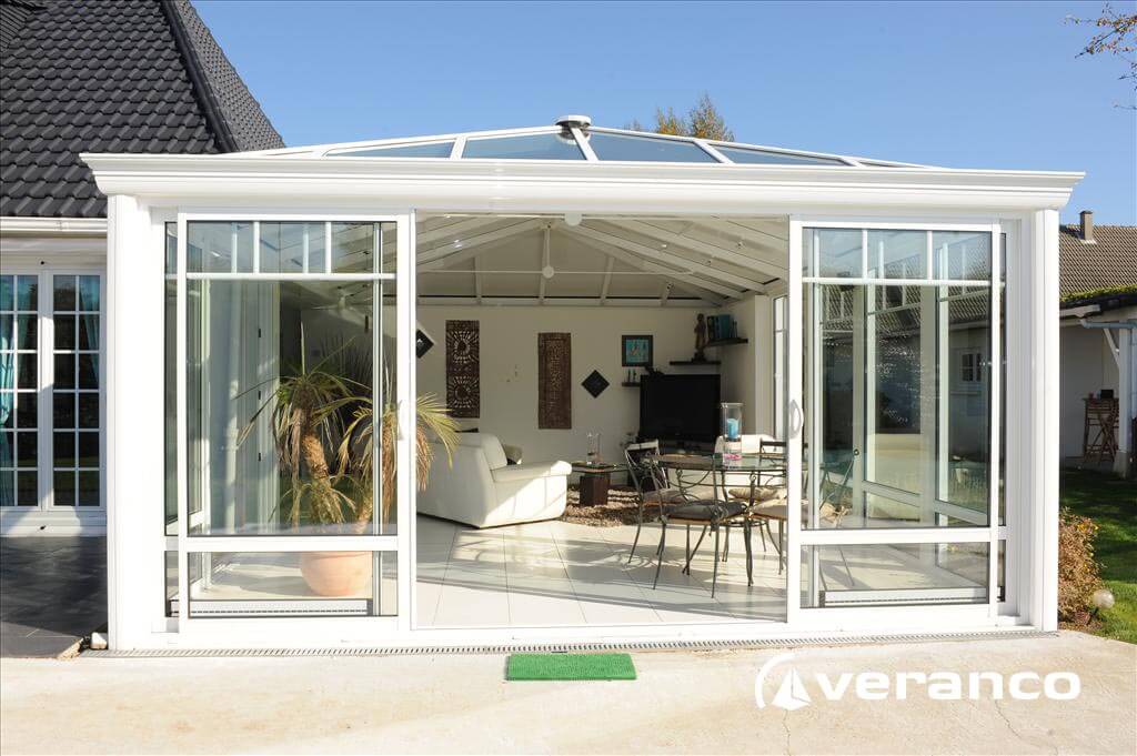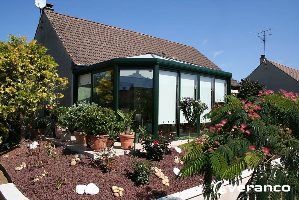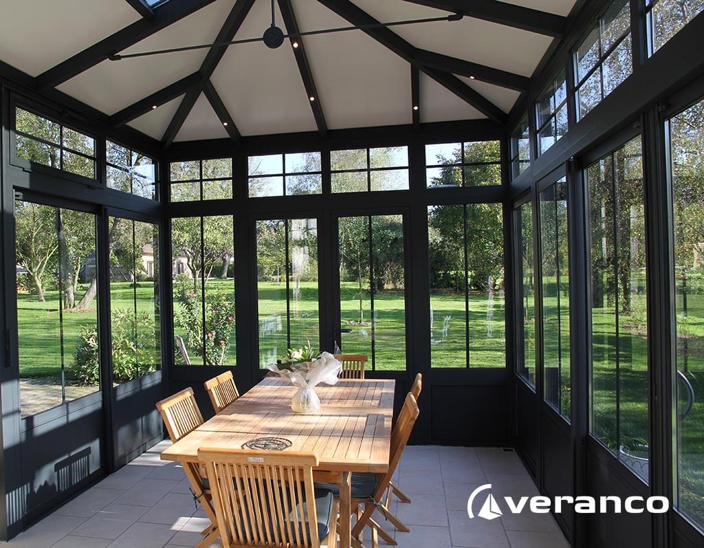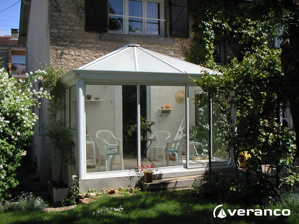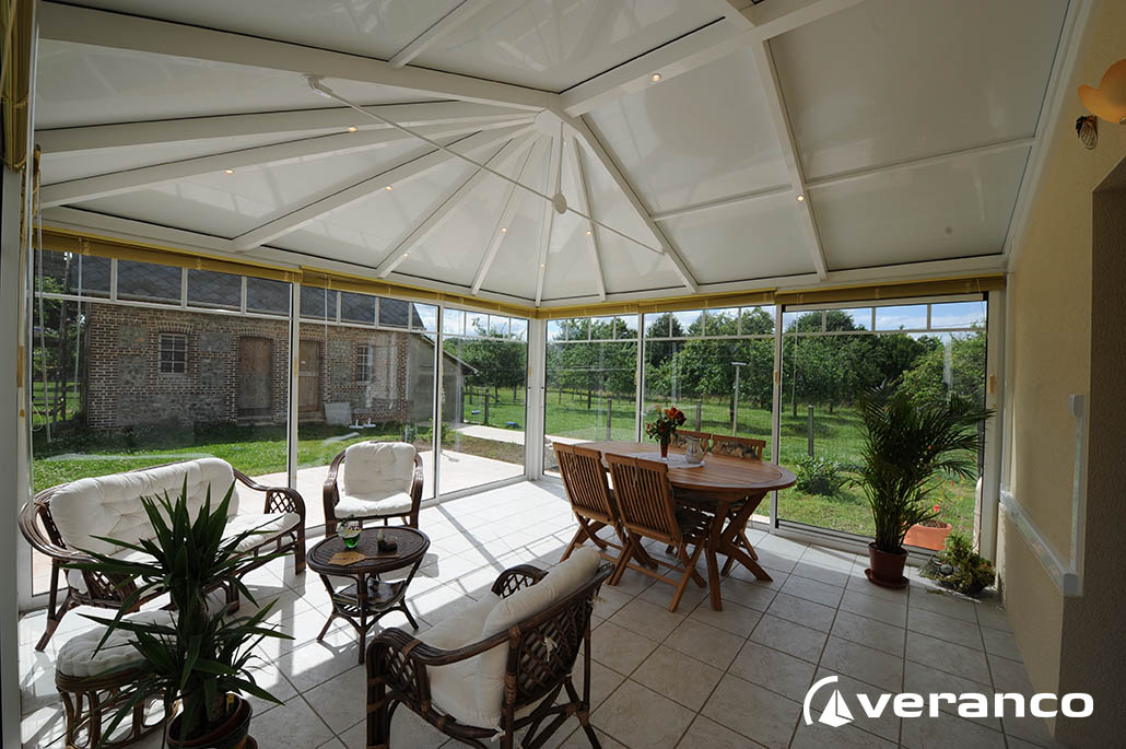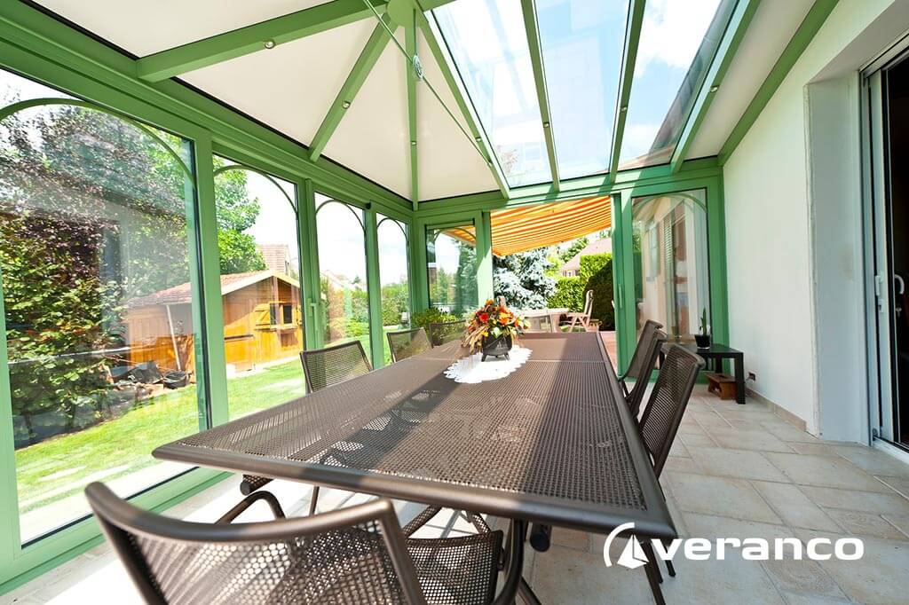 La Véranda Grenat est composée d'une toiture rectangulaire à facettes rayonnantes avec une double pente. Sa toiture offre une grande hauteur sous plafond pour une réelle impression de volume et d'espace. Cette conception permet de jouer astucieusement avec le verre et les panneaux isolant afin de gagner en originalité et en design. La hauteur de sa toiture favorise l’encadrement d’ouvertures hautes.